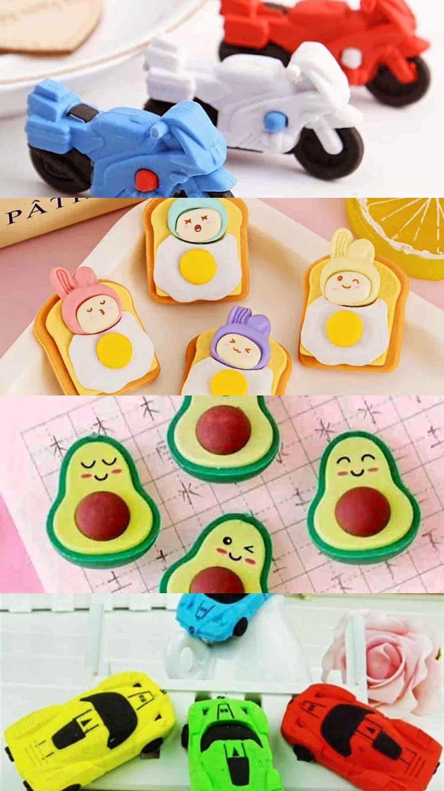 Colección de borradores con diseños adorables y coloridos estilo kawaii. Variedad de formas y personajes para elegir tu favorito y hacer de corregir errores una experiencia divertida y cute.